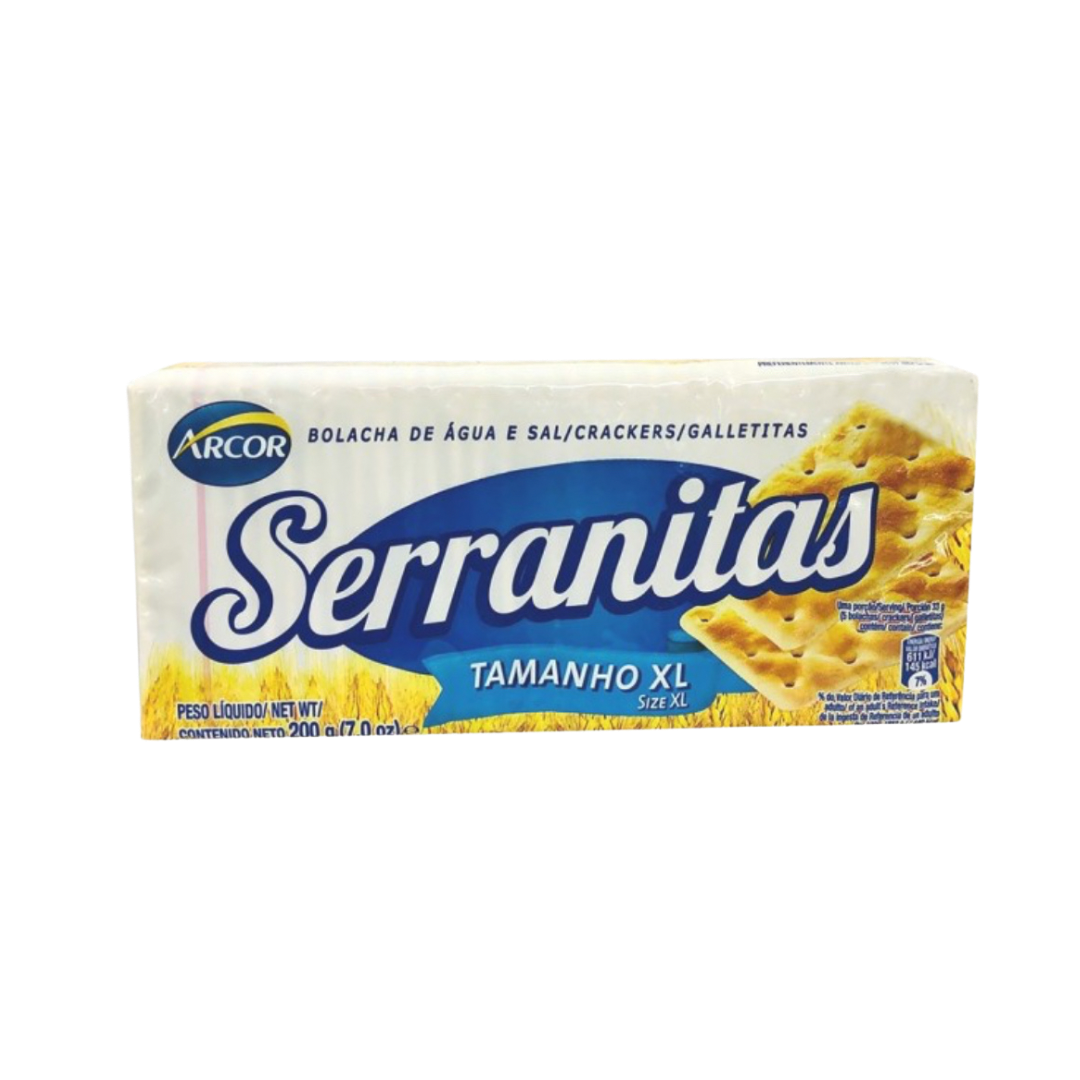 Las galletas Serranitas también conocidas como galletas de agua y sal, son producidas por la marca Arcor, conocidas por su textura crujiente y tamaño grande.