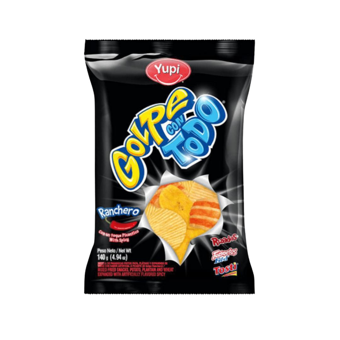 El Golpe con Todo Ranchero y original de 90 g es el snack ideal para quienes buscan disfrutar de una explosión de sabor. Con un toque ranchero que combina especias y aromas irresistibles, esta mezcla crujiente es perfecta para cualquier momento del día.