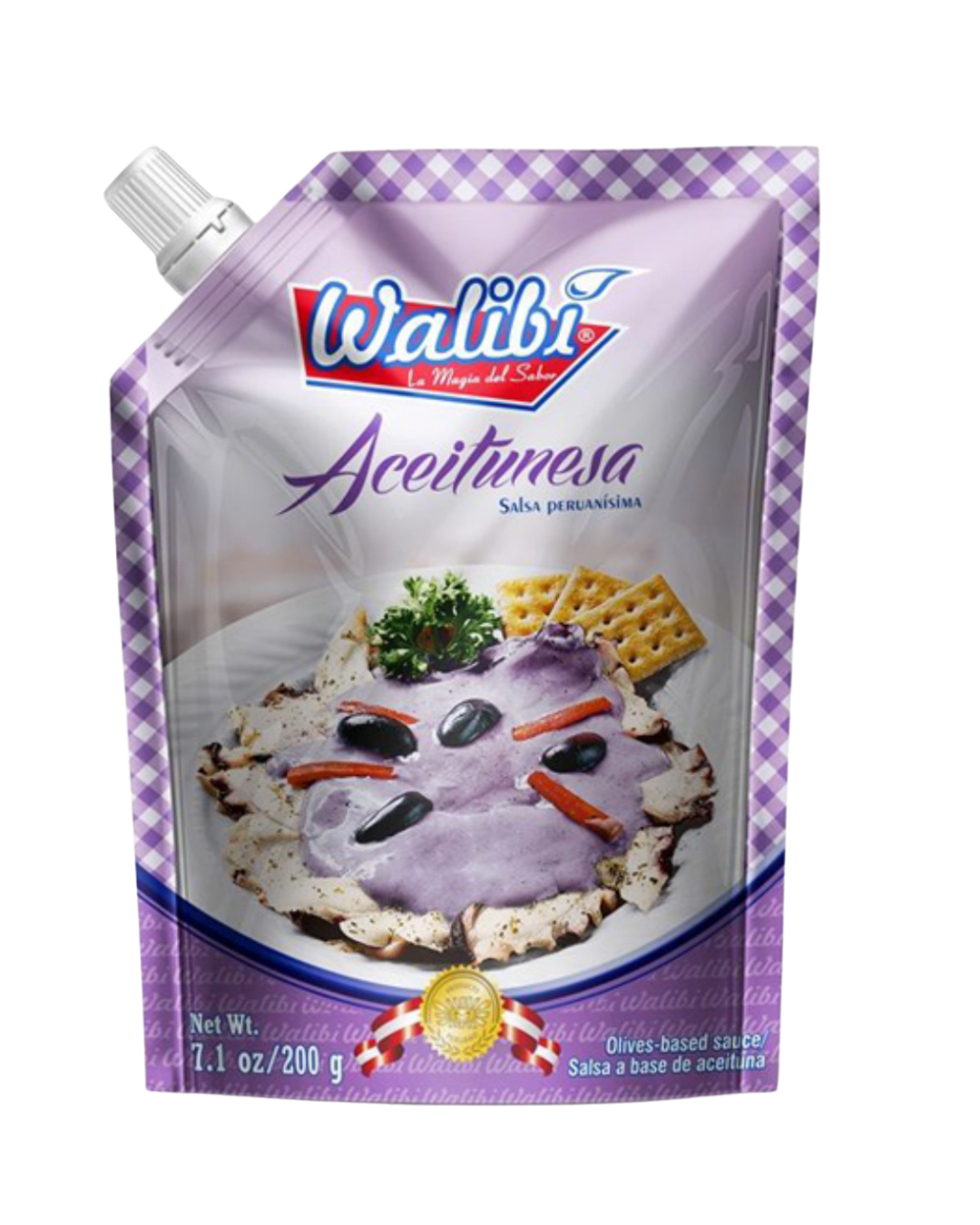 Salsa cremosa de origen peruano elaborada con pulpa de aceitunas negras, aceite vegetal, yema de huevo y especias, creando una textura suave y un sabor intenso a aceituna